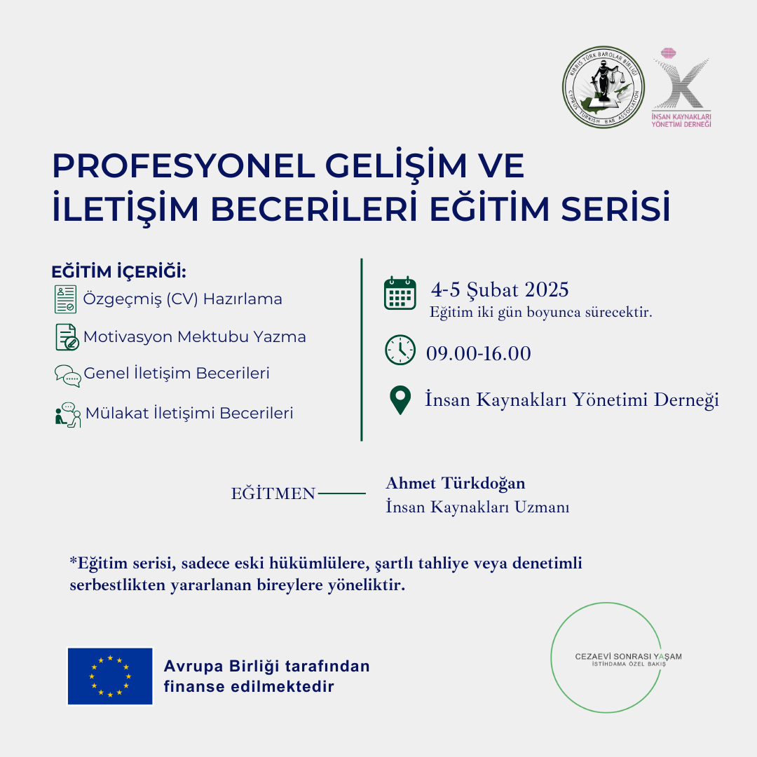 Cezaevi Sonrası Yaşam Projesi kapsamında Profesyonel Gelişim ve İletişim Becerileri Eğitim Serisi 4-5 Şubat tarihlerinde, 09.00-16.00 saatleri arasında İnsan Kaynakları Yönetimi Derneği’nde düzenlenecek.